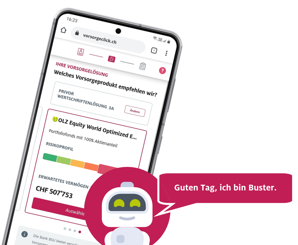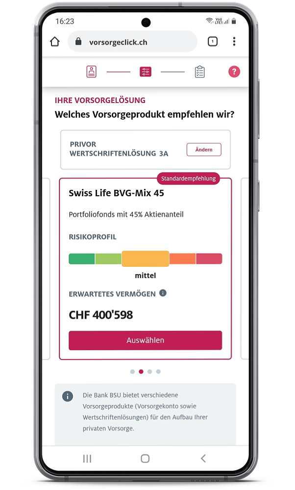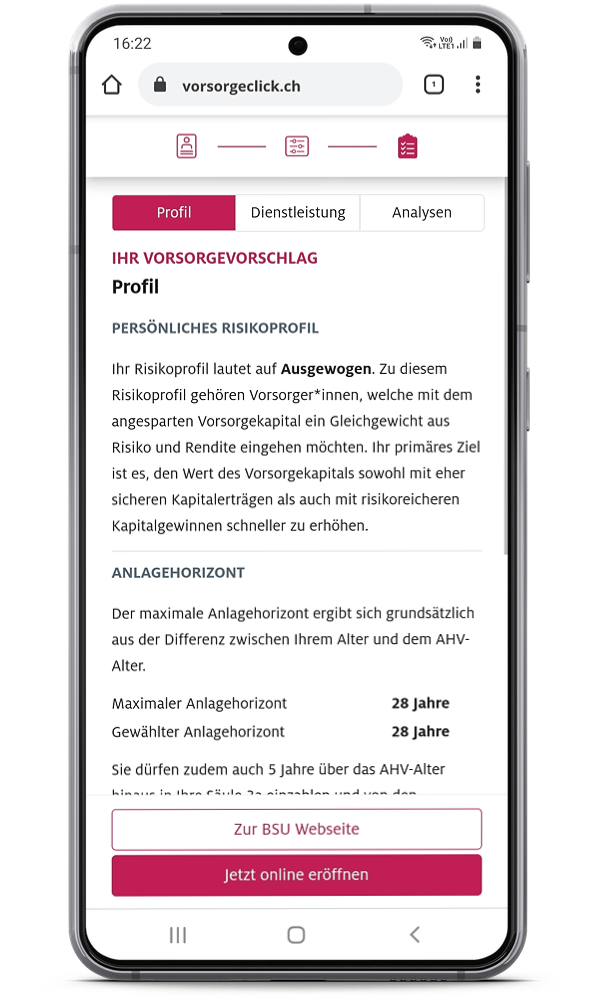 zeigen wir Ihnen die mögliche Wertentwicklung Ihres Vorsorgevermögens auf. Zudem können Sie festlegen, wie hoch der prozentuale Anteil Ihrer jeweiligen Einlage sein soll, welche investiert wird. All diese Eckdaten fliessen in Ihren persönlichen Vorsorgevorschlag ein, welchen Sie im nächsten Schritt aufrufen können.